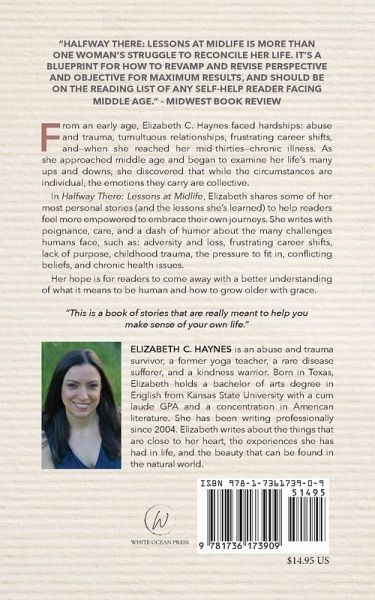 "Halfway There: Lessons at Midlife is a collection of stories that are meant to help readers make sense of their own lives - whether they're at the midpoint or not." From an early age, Elizabeth C. Haynes faced hardships: abuse and trauma, tumultuous relationships, frustrating career shifts, and-when she reached her mid-thirties-chronic illness. As she approached middle age and began to examine her life's many ups and downs, she discovered that while the circumstances are individual, the emotions they carry are collective. In Halfway There: Lessons at Midlife, Elizabeth shares some of her most personal stories (and the lessons she's learned) to help readers feel more empowered to embrace their own journeys. She writes with poignance, care, and a dash of humor about the many challenges humans face, such as: adversity and loss, frustrating career shifts, lack of purpose, childhood trauma, the pressure to fit in, conflicting beliefs, and chronic health issues. Her hope is for readers to come away with a better understanding of what it means to be human and how to grow older with grace.
