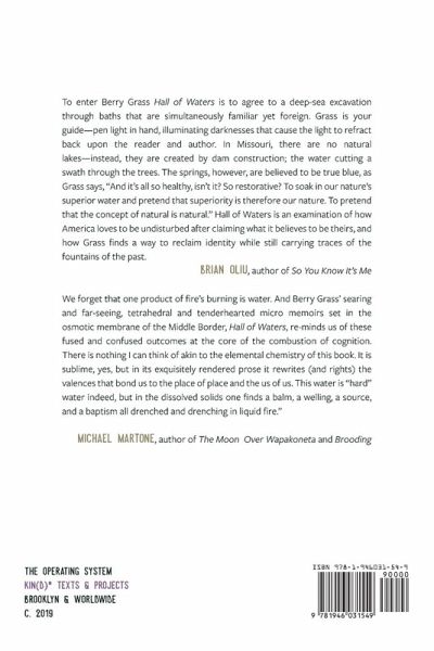 Recommended by Ms. Magazine as an August 2019 featured title! "To enter Berry Grass’ Hall of Waters is to agree to a deep-sea excavation through baths that are simultaneously familiar yet foreign. Grass is your guide—pen light in hand, illuminating darknesses that cause the light to refract back upon the reader and author. In Missouri, there are no natural lakes—instead, they are created by dam construction; the water cutting a swath through the trees. The springs, however, are believed to be true blue, as Grass says, 'And it’s all so healthy, isn’t it? So restorative? To soak in our nature’s superior water and pretend that superiority is therefore our nature. To pretend that the concept of natural is natural.' Hall of Waters is an examination of how America loves to be undisturbed after claiming what it believes to be theirs, and how Grass finds a way to reclaim identity while still carrying traces of the fountains of the past."––Brian Oliu, author of So You Know It’s Me "We forget that one product of fire’s burning is water. And Berry Grass’ searing and far-seeing, tetrahedral and tenderhearted micro memoirs set in the osmotic membrane of the Middle Border, Hall of Waters, re-minds us of these fused and confused outcomes at the core of the combustion of cognition. There is nothing I can think of akin to the elemental chemistry of this book. It is sublime, yes, but in its exquisitely rendered prose it rewrites (and rights) the valences that bond us to the place of place and the us of us. This water is 'hard' water indeed, but in the dissolved solids one finds a balm, a welling, a source, and a baptism all drenched and drenching in liquid fire."––Michael Martone, Author of The Moon Over Wapakoneta and Brooding HALL OF WATERS is an attempt to demythologize the rural American Midwest through the specific example of the author’s hometown, Excelsior Springs, MO. Through lyric essay & memoir, the book seeks to examine & undercut the inherent settler white supremacy of the Midwestern small-town, to deromanticize the nostalgia for land & place that is the hallmark of Midwestern art, & to think about what it was like growing up queer & trans in such a toxic environment. excerpts appear at: The Wanderer Tiny Mag Phoebe Journal Diagram The Fanzine The Map is Not