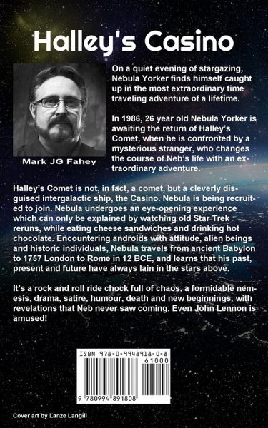 Halley's Casino is set in 1986. 26-year old Nebula Yorker (Neb to his friends), is patiently awaiting the return of Halley's Comet. He is about to discover that the world is not what it seems. Upon the arrival of Halley's Comet, Neb is confronted by a mysterious stranger who literally swoops out of the night sky. What happens next will change the course of Neb's life and that of all he befriends. This stranger (Mr. Tict) reveals to Neb that Halley's is not a comet at all, but an Intergalactic Casino that has been posing as a comet for countless years. Mr. Tict is the Concierge of the Casino and he has come back to Earth to recruit Neb as his assistant. What happens next is an eye-opening experience for young Neb that no one on Earth can imagine. It can only be explained by watching old Star Trek reruns, while eating cheese sandwiches and drinking hot chocolate. From androids with attitude to a vast assortment of alien beings and historic individuals, with a touch of time travel from ancient Babylon to 1757 London and back to Rome of 12 BCE, Neb soon learns that his past, present and future have always lain in the stars above. It's a rock and roll ride chock full of chaos, a formidable nemesis, drama, satire, humour, death and new beginnings, with revelations that Neb never saw coming. Even John Lennon is amused! Starting out on a quiet evening of star gazing, Nebula Yorker finds himself caught up in the most extraordinary time travel and planet saving adventure of a lifetime. And that's only the beginning of what is to come.