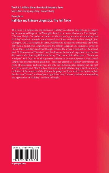 This book is a progressive exposition on Halliday's academic thought and its origins by the renowned linguist Hu Zhuanglin, based on 30 years of research. The first part, "Chinese Origin," introduces readers to the author's gradual understanding that Halliday's academic thought mainly came from Chinese scholars such as Wang Li, Luo Changpei, and Gao Mingkai. In 1980s, Halliday and his students introduced the theory of Systemic Functional Linguistics into the foreign language and linguistics circles in China; thus, Halliday's academic thought returned to where it originated. The second part, "A Discussion of Theories," mainly addresses the author's experience and further discussions after learning Halliday's theory. The theme of the third part is "Discourse Analysis" and focuses on the greatest difference between Systemic Functional Linguistics and traditional grammar-sentence grammar. Halliday emphasizes the study of "discourse," and sentences are only the embodiment of discourse atthe next level. The fourth part, "The Study of Chinese," applies Halliday's linguistic theory to the evolution of the research of the Chinese language in China, which can better explain the theme of "return" and is of great significance for Chinese scholars' understanding and application of Halliday's academic thought.