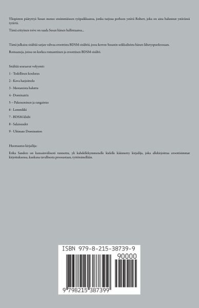 Yliopiston päätyttyä Susan menee ensimmäiseen työpaikkaansa, jonka tarjoaa perheen ystävä Robert, joka on aina halunnut ystävänsä tytärtä. Tämä erityinen toive on saada Susan hänen hallintaansa... Tämä julkaisu sisältää sarjan vahvaa eroottista BDSM-sisältöä, jossa kerron Susanin seikkailuista hänen lähetyspuoleessaan. Romaaneja, joissa on korkea romanttinen ja eroottinen BDSM-sisältö. Sisältää seuraavat volyymit: 1 - Todellinen koulutus 2 - Kova harjoittelu 3 - Mestareista haluttu 4 - Dominatrix 5 - Pakeneminen ja rangaistus 6 - Lemmikki 7 - BDSM-klubi 8 - Salaisuudet 9 - Ultimate Domination Huomautus kirjailija: Erika Sanders on kansainvälisesti tunnettu, yli kahdellekymmenelle kielelle käännetty kirjailija, joka allekirjoittaa eroottisimmat kirjoituksensa, kaukana tavallisesta proosastaan, tyttönimellään.