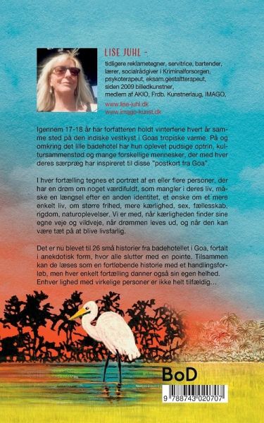 Igennem 17-18 år har forfatteren holdt vinterferie hvert år samme sted på den indiske vestkyst i Goas tropiske varme. På og omkring det lille badehotel har hun oplevet pudsige optrin, kultursammenstød og mange forskellige mennesker, der med hver deres særpræg har inspireret til disse ¿postkort fra Goä. I hver fortælling tegnes et portræt af en eller flere personer, der har en drøm om noget værdifuldt, som mangler i deres liv, måske en længsel efter en anden identitet, et ønske om et mere enkelt liv, om større frihed, mere kærlighed, sex, fællesskab, rigdom, naturoplevelser. Vi er med, når…mehr