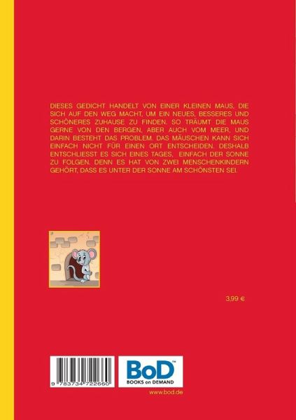 DIESES GEDICHT HANDELT VON EINER KLEINEN MAUS, DIE SICH AUF DEN WEG MACHT, UM EIN NEUES, BESSERES UND SCHÖNERES ZUHAUSE ZU FINDEN. SO TRÄUMT DIE MAUS GERNE VON DEN BERGEN, ABER AUCH VOM MEER, UND DARIN BESTEHT DAS PROBLEM. DAS MÄUSCHEN KANN SICH EINFACH NICHT FÜR EINEN ORT ENTSCHEIDEN. DESHALB ENTSCHLIESST ES SICH EINES TAGES, EINFACH DER SONNE ZU FOLGEN. DENN ES HAT VON ZWEI MENSCHENKINDERN GEHÖRT, DASS ES UNTER DER SONNE AM SCHÖNSTEN SEI.