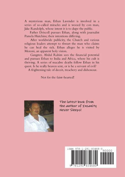 Mysterious man, Ethan Lavender is involved in a series of so-called miracles and is wooed by con man, Jake Randolph, whose intent it is to dupe the public. Father Driscoll pursues Ethan, along with journalist Pamela Hutchins; their intentions differing. After worldwide publicity, the Church and various religious leaders attempt to thwart the man who claims he can heal the sick. Ethan alleges he is visited by Moroni, an apparent holy vision. Gangster, Abdul Rahim sees the financial potential and pursues Ethan to India and Africa, where his cult is thriving. A series of macabre deaths follow Ethan in his quest. Is he really heaven sent, or is he a servant of evil? A frightening tale of deceit, treachery and dishonour. Not for the faint-hearted.