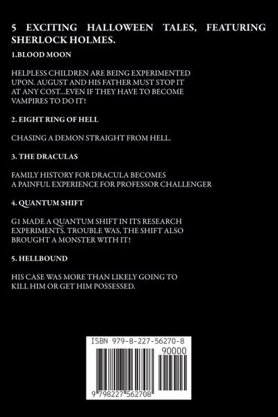 FIVE TALES OF HORROR AND TERROR, FEATURING SHERLOCK HOLMES 1. MAGIC AND ILLUSIONS IT COULD BE HARRY HOUDINI'S GREATEST ACT, BUT INSTEAD BECOMES A NIGHT OF TERROR! 2. DARK LEGENDS EXPLORATION BECOMES A NIGHTMARE OF TERROR. 3. DEADLY CONSEQUENCES A TRAIL OF TERROR AND TORTURE WITH NO END IN SIGHT. 4 CIRCLE OF DEATH POISONED IN THE MIDST OF FRIENDS. 5. BROKEN FANGS HELPING A DEADLY VAMPIRE IS FAR WORSE THAN BEING BITTEN BY ONE!