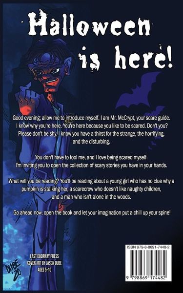 Good evening; allow me to introduce myself. I am Mr. McCrypt, your scare guide. I know why you're here. You're here because you like to be scared. Don't you? Please don't be shy. I know you have a thirst for the strange, the horrifying, and the disturbing. You don't have to fool me, and I love being scared myself. I'm inviting you to open the collection of scary stories you have in your hands. What will you be reading? You'll be reading about a young girl who has no clue why a pumpkin is stalking her, a scarecrow who doesn't like naughty children, and a man who isn't alone in the woods. Go ahead now, open the book and let your imagination put a chill up your spine!
