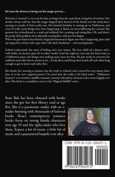 He's just the demon to bring out her magic powers… Raised as a "normal", it was easy for Jane to forget that she came from a long line of witches. Her mother always told her that the magic skipped their branch of the family tree but lately Jane's starting to wonder if that's really true. Her fortieth birthday is coming up on Halloween, and a lot of really weird things have been happening. A black cat starts following her around. She pictures her ex-boyfriend as a toad and suddenly he's croaking and eating flies. Oh, and there's the pesky little problem of accidentally starting fires with just her fingers. When she goes back to her family's magical homestead to figure out what's happening, Jane ends up trapped in a closet with a guy who's tall, dark, handsome -- and wearing horns. Gabriel understands the stress of hiding one's true nature. The love child of a demon and a wolf shifter, he doesn't quite fit in either world. Until the night he runs into his fated mate at a Halloween party and things start making more sense for him. He just needs to convince his stubborn mate that they're meant to be... if only they could keep their hands off each other long enough to get to know each other first. She thinks he's wearing a costume, but the truth is, Gabriel can't conceal his true nature from Jane. Is it her new magical powers? Or proof that she really is his fated mate? "Halloween Surprise" is an instalove midlife romantic comedy with plenty of steam and a sweet happily ever after. This book is a standalone story in the "Magical Midlife" series. About the "Magical Midlife" series: Just outside the shifter town of Greysden sits Rosewater Manor, a place shrouded in magic. The Rosewater women and their friends all have special gifts, although sometimes they're a bit glitchy. At least until they find true love…