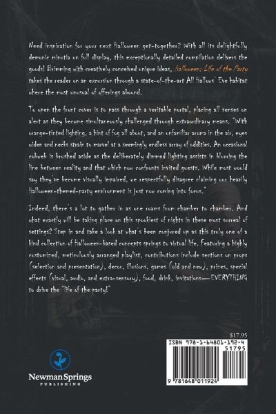 Need inspiration for your next Halloween get-together? With all its delightfully demonic minutia on full display, this exceptionally detailed compilation delivers the goods! Brimming with creatively conceived unique ideas, Halloween: Life of the Party takes the reader on an excursion through a state-of-the-art All Hallows’ Eve habitat where the most unusual of offerings abound. To open the front cover is to pass through a veritable portal, placing all senses on alert as they become simultaneously challenged through extraordinary means. "With orange-tinted lighting, a hint of fog all about, and an unfamiliar aroma in the air, eyes widen and necks strain to marvel at a seemingly endless array of oddities. An occasional cobweb is brushed aside as the deliberately dimmed lighting assists in blurring the line between reality and that which now confronts invited guests. While most would say they’ve become visually impaired, we respectfully disagree claiming our heavily Halloween-themed-party environment is just now coming into focus." Indeed, there’s a lot to gather in as one roams from chamber to chamber. And what exactly will be taking place on this spookiest of nights in these most surreal of settings? Step in and take a look at what’s been conjured up as this truly one of a kind collection of Halloween-based concepts springs to virtual life. Featuring a highly customized, meticulously arranged playlist, contributions include sections on props (selection and presentation), decor, illusions, games (old and new), prizes, special effects (visual, audio, and extra-sensory), food, drink, invitations—EVERYTHING to drive the "life of the party!"