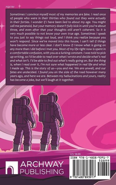 Sometimes I convince myself most of my memories are fake. I read once of people who were in their thirties who found out they were actually in their forties. I wonder if I have been lied to about my age. You might call me paranoid, but your memory doesn't fully kick in until you're about three, and even after that your thoughts still aren't coherent. So it is very much possible to not know your own true age. Sometimes I speak to you just to say things out loud, and I think you realize because you won't respond. Since we've moved into this house, I can't tell if things have become more or less clear. I don't know if I know what is going on any more than I did before I met you. Most of my life right now is spent in a comfortable confusion, with you as a lurking constant. I was told to pick up writing, so I'd be able to read over what I wrote and decide what's real and what isn't. I'd be able to find out what's really going on. But the thing is, when I read over it, I'm not sure what happened in real life and what I made up. This is the story of us-you and me. We are unwell, and our fates are undecided. I found you on the side of the road however many years ago, and here we are. Between my hallucinations and yours, reality has become a joke, but we'll laugh at it together.