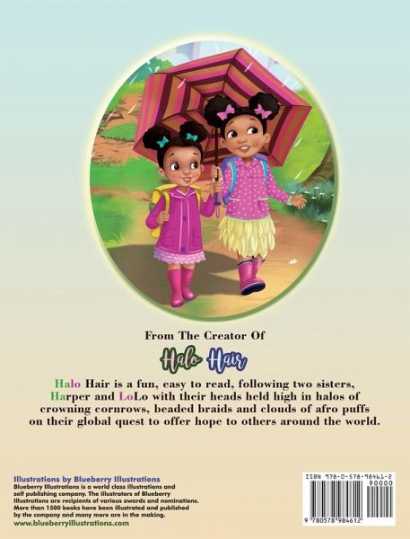 From The Creator Of Halo Hair Halo Hair is a fun, easy to read, following two sisters, Harper and LoLo with their heads held high in halos of crowning cornrows, beaded braids and clouds of afro puffs on their global quest to offer hope to others around the world. *The "Ha" letters in Harper in green and the first two letters "Lo" in LoLo in pink. (spells out Halo)