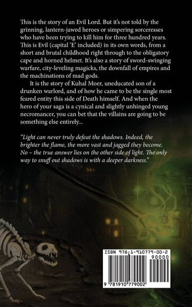 This is a story of an Evil lord. But it's not told by the grinning, lantern-jawed heroes or simpering sorceresses who have been trying to kill him for three hundred years. It is the story of Kuhal Moer, uneducated son of a drunken warlord, and of how he came to be the single most feared entity this side of Death himself. And when the hero of your saga is a cynical and slightly unhinged young necromancer, you can bet that the villains are going to be something else entirely... Kuhal Moer wields powers that bend gods into trembling wrecks as he summons towering beasts from the mud of the battlefield composed of the corpses of the slain. Ride with the Drakken in the icy skies above vast war keels hewn from the mountains themselves, floating stone war cities bristling with canons. Witness city-levelling magical battles that tear the very fabric of the universe asunder. … and the Nameless ones. Well, what can be said of them except that they make the Cenobites from Hellraiser look like the Teletubbies in comparison.