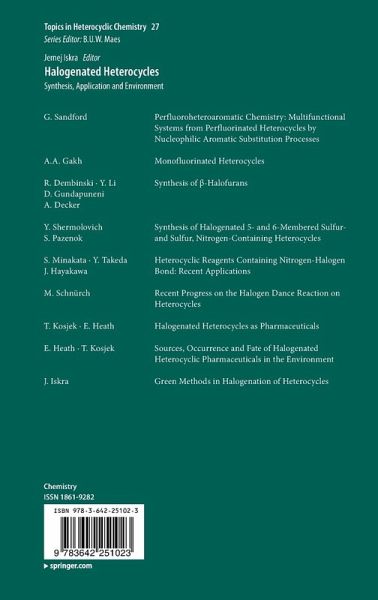 G. Sandford: Perfluoroheteroaromatic Chemistry: Multifunctional Systems from Perfluorinated Heterocycles by Nucleophilic Aromatic Substitution Processes.- A. A. Gakh: Monofluorinated Heterocycles.- R. Dembinski Y. Li D. Gundapuneni A. Decker: Synthesis of beta-Halofurans.- Y. Shermolovich S. Pazenok: Synthesis of halogenated 5- and 6-membered sulfur- and Sulfur, Nitrogen Containing Heterocycles.- S. Minakata Y. Takeda J. Hayakawa: Heterocyclic Reagents Containing Nitrogen-Halogen Bond: Recent Applications.- Michael Schnürch: Recent Progress on the Halogen Dance Reaction on Heterocycles.- T. Kosjek E. Heath: Halogenated Heterocycles as Pharmaceuticals.- E. Heath T. Kosjek: Sources, Occurrence and Fate of Halogenated Heterocyclic Pharmaceuticals in the Environment.- J. Iskra: Green Methods in Halogenation of Heterocycles.