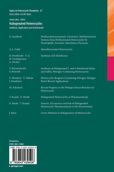 G. Sandford: Perfluoroheteroaromatic Chemistry: Multifunctional Systems from Perfluorinated Heterocycles by Nucleophilic Aromatic Substitution Processes.- A. A. Gakh: Monofluorinated Heterocycles.- R. Dembinski Y. Li D. Gundapuneni A. Decker: Synthesis of beta-Halofurans.- Y. Shermolovich S. Pazenok: Synthesis of halogenated 5- and 6-membered sulfur- and Sulfur, Nitrogen Containing Heterocycles.- S. Minakata Y. Takeda J. Hayakawa: Heterocyclic Reagents Containing Nitrogen-Halogen Bond: Recent Applications.- Michael Schnürch: Recent Progress on the Halogen Dance Reaction on Heterocycles.- T. Kosjek E. Heath: Halogenated Heterocycles as Pharmaceuticals.- E. Heath T. Kosjek: Sources, Occurrence and Fate of Halogenated Heterocyclic Pharmaceuticals in the Environment.- J. Iskra: Green Methods in Halogenation of Heterocycles.