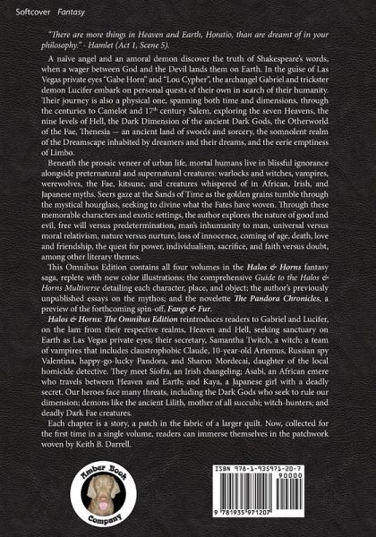 "There are more things in Heaven and Earth, Horatio, than are dreamt of in your philosophy." - Hamlet (Act 1, Scene 5). A naïve angel and amoral demon discover the truth of Shakespeare's words, when a wager between God and the Devil lands them on Earth. In the guise of Las Vegas private eyes "Gabe Horn" and "Lou Cypher", the archangel Gabriel and trickster demon Lucifer embark on personal quests of their own in search of their humanity. Their personal journey is also a physical one, spanning both time and dimensions, through the centuries to Camelot and 17th century Salem, exploring the seven Heavens, the nine levels of Hell, the Dark Dimension of the ancient Dark Gods, Thenesia - an ancient land of swords and sorcery, the somnolent realm of the Dreamscape, and the eerie emptiness of Limbo. Beneath the prosaic veneer of urban life, mortal humans live in blissful ignorance alongside preternatural and supernatural creatures: warlocks and witches, vampires, werewolves, the Fae, kitsune, and creatures whispered of in myths of African, Irish, and Japanese cultures. Seers gaze at the Sands of Time as the golden grains tumble through the mystical hourglass, seeking to divine what the Fates have woven. Through these memorable characters and exotic settings, the author explores the nature of good and evil, free will versus predetermination, man's inhumanity to man, universal versus moral relativism, nature versus nurture, loss of innocence, coming of age, death, love and friendship, the quest for power, individualism, sacrifice, and faith versus doubt, among other literary themes. This Omnibus Edition collects all four volumes in the Halos & Horns fantasy saga, replete with new illustrations; the "Guide to the Halos & Horns Multiverse" detailing each character, place, and object; previously unpublished essays by the author; and the novelette The Pandora Chronicles, a preview of the forthcoming spin-off, Fangs & Fur.