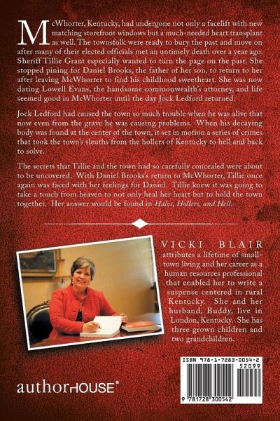 McWhorter, Kentucky, had undergone not only a facelift with new matching storefront windows but a much-needed heart transplant as well. The townsfolk were ready to bury the past and move on after many of their elected officials met an untimely death over a year ago. Sheriff Tillie Grant especially wanted to turn the page on the past. She stopped pining for Daniel Brooks, the father of her son, to return to her after leaving McWhorter to find his childhood sweetheart. She was now dating Lowell Evans, the handsome commonwealth's attorney, and life seemed good in McWhorter until the day Jock Ledford returned. Jock Ledford had caused the town so much trouble when he was alive that now even from the grave he was causing problems. When his decaying body was found at the center of the town, it set in motion a series of crimes that took the town's sleuths from the hollers of Kentucky to hell and back to solve. The secrets that Tillie and the town had so carefully concealed were about to be uncovered. With Daniel Brooks's return to McWhorter, Tillie once again was faced with her feelings for Daniel. Tillie knew it was going to take a touch from heaven to not only heal her heart but to hold the town together. Her answer would be found in Halos, Hollers, and Hell.