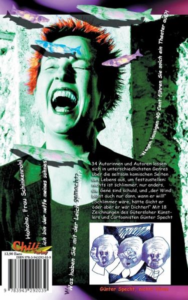 _Seltsam Komisches aus dem Irrgarten des Lebens_Mit 18 Zeichnungen des Gütersloher Künstlers und Cartoonisten Günter Specht. "Wegen lausigen 40 Cent führen Sie solch ein Theater auf?!"ich bin der neffe meines sohnes!"Was haben Sie mit der Leiche gemacht?"34 Autorinnen und Autoren aus Deutschland und Österreich lassen sich in unterschiedlichsten Genres über die seltsam komisches Seiten des Lebens aus, um festzustellen: nichts ist schlimmer, nur anders, die Gene sind schuld und "der Wind bläst auch nur dann, wann er will."Wenn die Prä-Computer-Generation Buchbestellungen im Internet tätigt oder der ermittelnde Kommissar sich als Mörder entpuppt, wenn vor lauter Apps die Kontaktdaten vertauscht werden oder wenn Ludwig der II. sich zusammen mit Rainer Werner Fassbinder als Akteur auf einem Münchner Fußballfeld wiederfindet, dann ist es an der Zeit, eine Anleitung fürs eigene Märchen -Basteln bereitzustellen. Ein urkomisches Lesebuch mit 'tierischen' Elementen und einem kleinen Plädoyer für Unordnung. Der chiliverlag (Der Fisch ist Käse - Veggie? Voll logisch!, von der VEBU nominiert für die Wahl zum Veggie-Sachbuch 2013) präsentiert seinen neuesten Leseband mit skurrilen und komischen Episoden, Gedichten und Bühnentexten von 34 bekannten und aufstrebenden Autoren aus ganz Deutschland und Österreich. Schriftsteller wie Gerald Jatzek, Andreas Schumacher, Jürgen Volkert-Marten und Sandra Niermeyer, Bühnenautoren wie Klaus Urban oder Michel Pauwels, Lyriker wie Bernhard Winter oder Josef Hader sowie der Münchner Filmemacher Richard Westermaier u.v.a.m. geben ihre satirische Sicht auf das absurde Weltentheater zum Besten. Der bekannte Gütersloher Cartoonist und Kunstmultiplikator Günter Specht (Güterslohtagebuch) steuerte eine Vielzahl an Illustrationen zu diesem abwechlungsreichen und unterhaltsamen Leseband bei. Mit Texten von Andresen, Brakhage, Hader, Hornauer, Jatzek, Kandeler, Kerschbaumer, Knopp, Lang, Leuschner, Mathies, Minrath, Neuhalfen, Nickel,Niermeyer, Pauwels, Röchter, Rohn, Ruhenstroth, Sawall, Schätte,Schmid, Schumacher, Siepler, Skoerat, Specht, Spindler, Stückemann, Urban, Völkert-Marten, Wallrabenstein, Westermaier, Wiegelmann, Winter