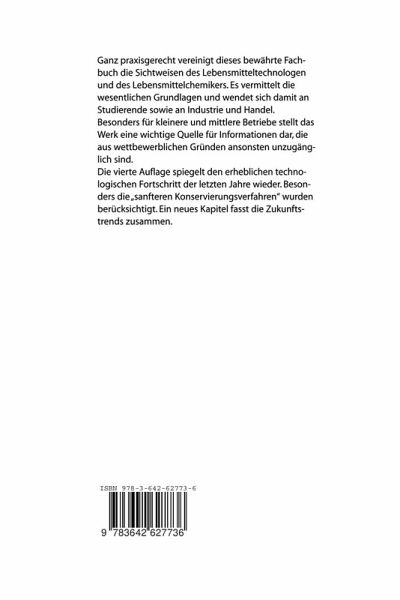 Ganz praxisgerecht vereinigt dieses bewährte Fachbuch die Sichtweisen des Lebensmitteltechnologen und des Lebensmittelchemikers. Es vermittelt die wesentlichen Grundlagen und wendet sich damit an Studierende sowie an Industrie und Handel. Besonders für kleinere und mittlere Betriebe stellt das Werk eine wichtige Quelle für Informationen dar, die aus wettbewerblichen Gründen ansonsten unzugänglich sind. Die vierte Auflage spiegelt den erheblichen technologischen Fortschritt der letzten Jahre wieder. Besonders die "sanfteren Konservierungsverfahren" wurden berücksichtigt. Ein neues Kapitel fasst die Zukunftstrends zusammen.