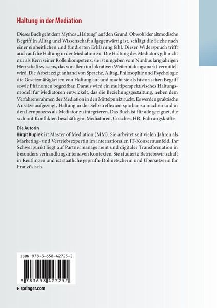 Dieses Buch geht dem Mythos "Haltung" auf den Grund. Obwohl der altmodische Begriff in Alltag und Wissenschaft allgegenwärtig ist, schlägt die Suche nach einer einheitlichen und fundierten Erklärung fehl. Dieser Widerspruch trifft auch auf die Haltung in der Mediation zu. Die Haltung des Mediators gilt nicht nur als Kern seiner Rollenkompetenz, sie ist umgeben vom Nimbus langjährigen Herrschaftswissens, das vor allem im lukrativen Weiterbildungsmarkt vermittelt wird. Die Arbeit zeigt anhand von Sprache, Alltag, Philosophie und Psychologie die Gesetzmäßigkeiten von Haltung auf und macht sie als historischen Begriff sowie Phänomen begreifbar. Daraus wird ein multiperspektivisches Haltungsmodell für Mediatoren entwickelt, das die Beziehungsgestaltung, neben dem Verfahrensrahmen der Mediation in den Mittelpunkt rückt. Es werden praktische Ansätze aufgezeigt, Haltung in der Selbstreflexion spürbar zu machen und in den Lernprozess als Mediator zu integrieren. Das Buch ist für alle geeignet, die sich mit Konflikten beschäftigen: Mediatoren, Coaches, HR, Führungskräfte.