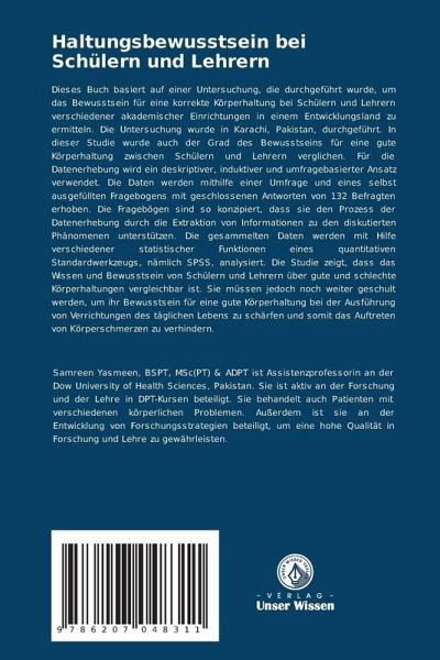 Dieses Buch basiert auf einer Untersuchung, die durchgeführt wurde, um das Bewusstsein für eine korrekte Körperhaltung bei Schülern und Lehrern verschiedener akademischer Einrichtungen in einem Entwicklungsland zu ermitteln. Die Untersuchung wurde in Karachi, Pakistan, durchgeführt. In dieser Studie wurde auch der Grad des Bewusstseins für eine gute Körperhaltung zwischen Schülern und Lehrern verglichen. Für die Datenerhebung wird ein deskriptiver, induktiver und umfragebasierter Ansatz verwendet. Die Daten werden mithilfe einer Umfrage und eines selbst ausgefüllten Fragebogens mit geschlossenen Antworten von 132 Befragten erhoben. Die Fragebögen sind so konzipiert, dass sie den Prozess der Datenerhebung durch die Extraktion von Informationen zu den diskutierten Phänomenen unterstützen. Die gesammelten Daten werden mit Hilfe verschiedener statistischer Funktionen eines quantitativen Standardwerkzeugs, nämlich SPSS, analysiert. Die Studie zeigt, dass das Wissen und Bewusstsein vonSchülern und Lehrern über gute und schlechte Körperhaltungen vergleichbar ist. Sie müssen jedoch noch weiter geschult werden, um ihr Bewusstsein für eine gute Körperhaltung bei der Ausführung von Verrichtungen des täglichen Lebens zu schärfen und somit das Auftreten von Körperschmerzen zu verhindern.