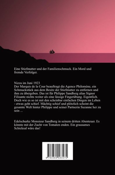 Eine Stiefmutter und der Familienschmuck. Ein Mord und fremde Verfolger.Nizza im Juni 1923Der Marquis de la Cour beauftragt die Agence Philomène, ein Schmuckstück aus dem Besitz der Stiefmutter zu entfernen und ihm zu übergeben. Das ist für Philippe Sandberg alias Signor Filisante nichts weiter als eine lässige Fingerübung. Eigentlich.Doch wie es so ist mit den scheinbar einfachen Dingen im Leben - etwas geht schief. Mächtig schief und plötzlich scheint die gesamte Welt hinter Philippe und seiner Partnerin Suzanne her zu sein ...Edelschurke Monsieur Sandberg in seinem dritten Abenteuer. Es könnte mit der Zucht von Tomaten enden. Ein grausames Schicksal wäre das!