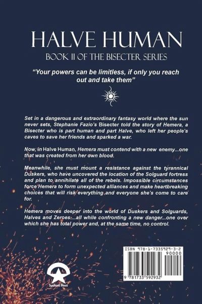 Set in a dangerous and extraordinary fantasy world where the sun never sets, Stephanie Fazio's BISECTER told the story of Hemera, a Bisecter who is part human and part Halve, who left her people's caves to save her friends and sparked a war. Now, in HALVE HUMAN, Hemera must contend with a new enemy…one that was created from her own blood. Meanwhile, she must mount a resistance against the tyrannical Duskers, who have uncovered the location of the Solguard fortress and plan to annihilate all of the rebels. Impossible circumstances force Hemera to form unexpected alliances and make heartbreaking choices that will risk everything and everyone she's come to care for. Hemera moves deeper into the world of Duskers and Solguards, Halves and Zeroes….all while confronting a new danger…one over which she has total power and, at the same time, no control.