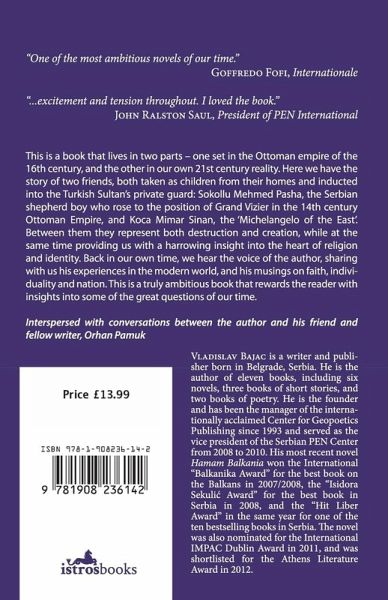 This is a book that lives in two parts - one set in the Ottoman empire of the 16th century, and the other in our own 21st century reality. Here we have the story of two friends, both taken as children from their homes and inducted into the Turkish Sultan's private guard: Sokollu Mehmed Pasha, the Serbian shepherd boy who rose to the position of Grand Vizier and Koca Mimar Sinan, the 'Michelangelo of the East'. Between them they represent both destruction and creation, while at the same time providing us with a harrowing insight into the heart of religion and identity. Back in our own time, we hear the voice of the author, sharing with us his experiences in the modern world, and his musings on faith, identity and nation. Vladislav Bajac is a novelist, story-teller, poet and publisher. He has worked as a journalist and translator from English into Serbian, and has edited dozens of literary texts, including several anthologies and books As an author, he has written 6 novels, 3 collections of short stories and 2 books of poetry. Vladislav Bajac was the vice-president of the Serbian PEN Centre 2008-10 and the founder and president of Geopoetika Publishing.