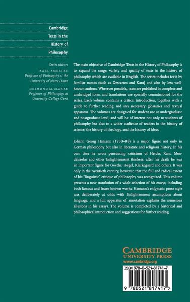 Johann Georg Hamann (1730–1788) is a major figure not only in German philosophy but also in literature and religious history. In his own time he wrote penetrating criticisms of Herder, Kant, Mendelssohn, and other Enlightenment thinkers; after his death he was an important figure for Goethe, Hegel, Kierkegaard, and others. It was only in the twentieth century, however, that the full and radical extent of his 'linguistic' critique of philosophy was recognized. This volume presents a new translation of a wide selection of his essays, including both famous and lesser-known works. Hamann's enigmatic prose-style was deliberately at odds with Enlightenment assumptions about language, and a full apparatus of annotation explains the numerous allusions in his essays. The volume is completed by a historical and philosophical introduction and suggestions for further reading.