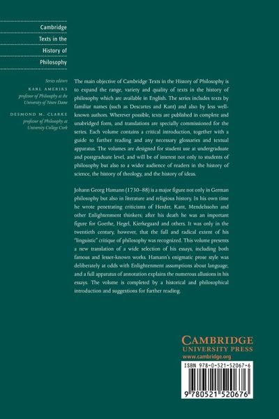 Johann Georg Hamann is a major figure not only in German philosophy but also in literature and religious history. This volume presents a translation of a wide selection of his essays, including both famous and lesser-known works. The volume is completed by an introduction and suggestions for further reading.
