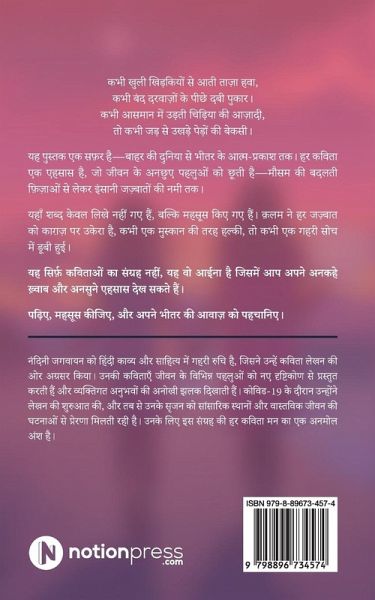 Sometimes it is the fresh air coming from open windows, Sometimes it is the suppressed call behind closed doors. Sometimes it is the freedom of a bird flying in the sky, And sometimes it is the helplessness of trees uprooted from their roots. This book is a journey-from the outside world to the inner self-illumination. Every poem is a feeling, which touches the untouched aspects of life-from the changing atmosphere of the seasons to the moisture of human emotions. Here words are not just written, but felt. The pen has engraved every emotion on paper, sometimes light like a smile, and sometimes immersed in a deep thought. This is not just a collection of poems, it is a mirror in which you can see your unspoken dreams and unheard feelings. Read, feel, and recognize the voice within you.
