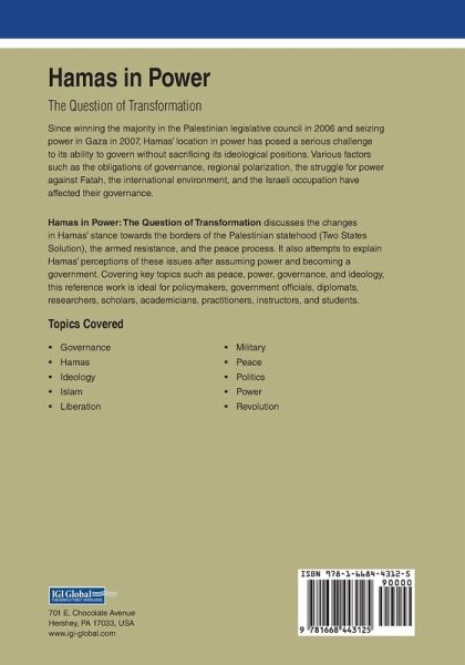 Since winning the majority in the Palestinian legislative council in 2006 and seizing power in Gaza in 2007, Hamas' location in power has posed a serious challenge to its ability to govern without sacrificing its ideological positions. Various factors such as the obligations of governance, regional polarization, the struggle for power against Fatah, the international environment, and the Israeli occupation have affected their governance. Hamas in Power: The Question of Transformation discusses the changes in Hamas' stance towards the borders of the Palestinian statehood (Two States Solution), the armed resistance, and the peace process. It also attempts to explain Hamas' perceptions of these issues after assuming power and becoming a government. Covering key topics such as peace, power, governance, and ideology, this reference work is ideal for policymakers, government officials, diplomats, researchers, scholars, academicians, practitioners, instructors, and students.