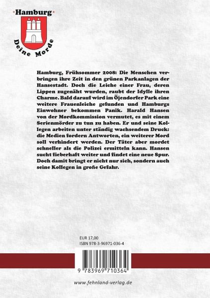 Hamburg, Frühsommer 2008: Die Menschen verbringen ihre Zeit in den grünen Parkanlagen der Hansestadt. Doch die Leiche einer Frau, deren Lippen zugenäht wurden, raubt der Idylle ihren Charme. Bald darauf wird im Öjendorfer Park eine weitere Frauenleiche gefunden und Hamburgs Einwohner bekommen Panik. Harald Hansen, Kommissar der Mordkommission, vermutet, es mit einem Serienmörder zu tun zu haben. Er und seine Kollegen arbeiten unter ständig wachsendem Druck: die Medien fordern Antworten, ein weiterer Mord soll verhindert werden. Der Täter aber mordet schneller als die Polizei ermitteln kann. Hansen sucht fieberhaft weiter und findet eine neue Spur. Doch damit bringt er nicht nur sich, sondern auch seine Kollegen in große Gefahr.Der 2. Fall des bärbeißigen Hamburger Kommissars bietet wieder Krimigenuss vom Feinsten. Die grausame Mordserie führt Ermittler und Leser auf eine spannende Jagd durch die Hamburger Parkanlagen östlich der Alster - und sicherlich wird nicht nur den Einwohnern der Stadtteile Barmbek, Bramfeld und Horn ein Schauer über den Rücken laufen, wenn sie - bisher ahnungslos - an den Schauplätzen der Serienmorde vorübergehen.