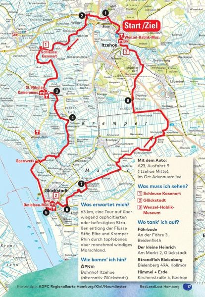 26 Rundtourenauf den landschaftlich schönsten Strecken zu den bedeutendsten Sehenswürdigkeiten der Region.Rund um Hamburg erstreckt sich das norddeutsche Binnenland in all seinen Facetten - Moore, Heide, Wälder und Seen bieten ideale Voraussetzungen für abwechslungsreiche Radtouren.Auf vielen der Touren ist Wasser das bestimmende Element - ob an der Elbe, Stör oder Oste, ob an den Seen im Herzogtum Lauenburg oder in der Holsteinischen Schweiz. Und wo Wasser ist, ist Leben: Kleine Häfen, versteckte Strände, riesige Schiffe und altes Handwerk prägen das Bild des norddeutschen Binnenlandes. Und nicht nur das - auch weite Marsche und wellige Knicklandschaften kommen nicht zu kurz. Diese Vielfalt lässt sich kaum besser erfahren als mit dem Rad.Alle Touren sind mit der Bahn erreichbar und bieten Hinweise auf Reisemobil-Stellplätze und Einkehr.zusätzliches kostenfreies Online-Angebot:gpx-Tracks der Touren zum Download1 Rundtour Itzehoe - Beidenfleth - Glückstadt - Kremper Marsch 2 Rundtour Elmshorn - Seestermühe - Uetersen 3 Rundtour Klein Flottbek - Wedel - entlang der Elbe 4 Rundtour Pinneberg - Ellerhoop - Tornesch 5 Rundtour Neumünster - Hennstedt - Aukrug 6 Rundtour Bad Bramstedt - Großenanspe - Kellinghusen 7 Rundtour Bad Segeberg - Tensfeld - Nehms - Warder 8 Rundtour Ohlsdorf - Ohlstedt - Volksdorf - Bramfeld 9 Rundtour Großhansdorf - Hamfelde - Kuddewörde - Glinde10 Rundtour Bad Oldesloe - Nütschau - Reinfeld (Holstein)11 Rundtour Lübeck - Travemünde - Timmendorfer Strand - Bad Schwartau12 Rundtour Ratzeburg - Schaalseeregion - durch zwei Bundesländer13 Rundtour Mölln - Lehmrade - Gudow14 Rundtour Lauenburg - Boizenburg - Bleckede15 Rundtour Brahlstorf - Neuhaus - Konau - Lübtheen16 Rundtour Bergedorf - Geesthacht - Friedrichsruh17 Rundtour Winsen - Lüneburg18 Rundtour Wintermoor - Wilsede - Hanstedt19 Rundtour Tostedt - Moisburg - Hollenstedt20 Rundtour Blankenese - Finkenwerder - Wihelmsburg21 Rundtour Buxtehude - Finkenwerder - Rosengarten22 RundtourHorneburg - Fredenbeck - Stade23 Rundtour Hemmoor - Neuhaus - Osten24 Streckentour Glückstadt - Stadt - Hamburg25 Streckentour Hamburg - Artlenburg - Lauenburg26 Streckentour Lauenburg - Bleckede - Konau - Hitzackermit Ortsbeschreibungen von Hamburg, Lübeck und Lüneburg