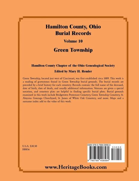 Green Township, located just west of Cincinnati, was first established circa 1809. This work is a reading of gravestones found in Green Township burial grounds. The burial records are preceded by a brief history for each cemetery. Records contain: the full name of the deceased, date of birth, date of death, and usually additional information. Veterans are given a special notation, and cemetery plats are helpful in finding specific burial plots. Burial grounds examined in this work include Bridgetown Protestant Cemetery, Green Township Cemetery, St. Aloysius Gonzaga Churchyard, St. James of White Oak Cemetery, and more. Maps and a surname index add to the value of this work.