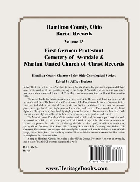 In May 1843, the First German Protestant Cemetery Society of Avondale purchased approximately four acres for the creation of their private cemetery in the Village of Avondale. The lots were sixteen square feet each and are numbered from 1-444. This village was incorporated into the City of Cincinnati in 1896. The record books for this cemetery were written entirely in German, and listed the names of all persons buried there. The Foreword and Constitution of the First German Protestant Cemetery Society have been included in the original German with an English translation. Records contain surname, given name, age, burial date, single grave or lot number, and remarks. These records are first listed alphabetically by surname, then listed by single grave or lot number. Lot owners are then listed both numerically and alphabetically and include name of owner, date of purchase and remarks. The Martini United Church of Christ was founded in 1851, and the second portion of this work is devoted to burials in their churchyard, with additional listings of burials moved to other sites. Records are grouped by burial place, including: the Martini churchyard, miscellaneous other sites, Spring Grove Cemetery, Vine Street Hill Cemetery, Baltimore Pike Cemetery, and Walnut Hill Cemetery. These records are arranged alphabetically by surname, and include birthplace, date of birth or age, date of death/burial and surviving relatives. These burial sites are nonexistent today. This section is complete with a surname index. A map of Hamilton County cemeteries, a plat of First German Protestant Cemetery of Avondale, and a plat of Martini Churchyard augment this work.