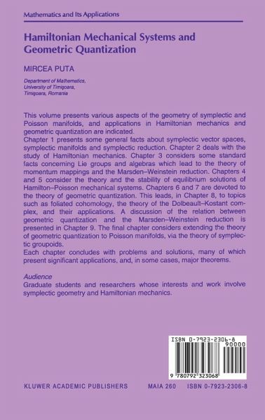 oara during the academic year 1990-1991. Its goal is to present in detail someold and new aspects ofthe geometry ofsymplectic and Poisson manifolds and to point out some of their applications in Hamiltonian mechanics and geometric quantization. The material is organized as follows. In Chapter 1 we collect some general facts about symplectic vector spaces, symplectic manifolds and symplectic reduction. Chapter 2 deals with the study ofHamiltonian mechanics. We present here the gen eral theory ofHamiltonian mechanicalsystems, the theory ofthe corresponding Pois son bracket and also some examples ofinfinite-dimensional Hamiltonian mechanical systems. Chapter 3 starts with some standard facts concerning the theory of Lie groups and Lie algebras and then continues with the theory ofmomentum mappings and the Marsden-Weinstein reduction. The theory of Hamilton-Poisson mechan ical systems makes the object of Chapter 4. Chapter 5 js dedicated to the study of the stability of the equilibrium solutions of the Hamiltonian and the Hamilton Poisson mechanical systems. We present here some of the remarcable results due to Holm, Marsden, Ra~iu and Weinstein. Next, Chapter 6 and 7 are devoted to the theory of geometric quantization where we try to solve, in a geometrical way, the so called Dirac problem from quantum mechanics. We follow here the construc tion given by Kostant and Souriau around 1964.