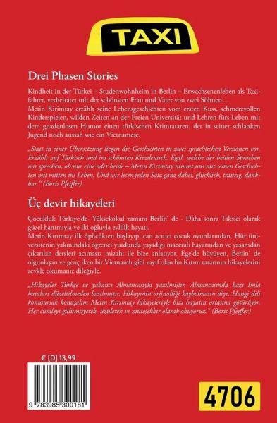 Kindheit in der Türkei - Studenwohnheim in Berlin - Erwachsenenleben als Taxifahrer,verheiratet mit der schönsten Frau und Vater von zwei Söhnen...Metin Kirimtay erzählt seine Lebensgeschichten vom ersten Kuss, schmerzvollenKinderspielen, wilden Zeiten an der Freien Universität und Lehren fürs Leben mitdem gnadenlosen Humor einen türkischen Krimtataren, der in seiner schlankenJugend noch aussah wie ein Vietnamese. / Çocukluk Türkiye'de- Yüksekokul zamani Berlin' de - Daha sonra Taksici olarakgüzel hanimiyla ve iki ogluyla evlilik hayati.Metin Kirimtay ilk öpücükten baslayip, can acitici çocuk oyunlarindan, Hür üniversiteninyakinindaki ögrenci yurdunda yasadigi macerali hayatindan ve yasamdançikarilan dersleri acimasiz mizahi ile bize anlatiyor. Ege'de büyüyen, Berlin' deolgunlasan ve genç iken bir Vietnamli gibi zayif olan bu Kirim tatarinin hikayelerinizevkle okumaniz dilegiyle.