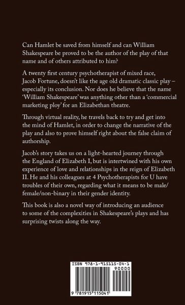 This fascinating novel prompts many unusual questions about the most famous play in the world. / It explores the mind of the quizzical Hamlet himself, and of Shakespeare - if he was, indeed, the author. / It features a 21st-century Psychotherapist of mixed race, Jacob Fortune, who doesn't like the age-old classic play - especially its conclusion. / In detective style, through virtual reality, he travels back to try to get into the mind of Hamlet, in order to change the narrative of the play and also to prove himself right about the false claim of authorship.
