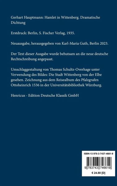 Gerhart Hauptmann: Hamlet in Wittenberg. Dramatische DichtungErstdruck: Berlin, S. Fischer Verlag, 1935.Neuausgabe, herausgegeben von Karl-Maria Guth, Berlin 2023.Der Text dieser Ausgabe wurde behutsam an die neue deutsche Rechtschreibung angepasst.Umschlagabbildung: Die Stadt Wittenberg von der Elbe gesehen. Zeichnung aus dem Reisealbum des Pfalzgrafen Ottoheinrich 1536 in der Universitätsbibliothek WürzburgGesetzt aus der Minion Pro, 11 pt.Die Sammlung Hofenberg erscheint im Verlag Henricus - Edition Deutsche Klassik GmbH, BerlinÜber den Autor:1862 als Sohn von Robert und Marie Hauptmann geboren, die im schlesischen Ober-Salzbrunn ein Hotel betreiben, bricht Gerhart Hauptmann nach jeweils kurzer Dauer eine landwirtschaftliche Ausbildung, das Einjährigen-Examen des preußischen Militärs, die Bildhauerklasse der könglichen Kunst- und Gewerbeschule in Breslau und schließlich ein Philosophiestudium in Jena, ein Zeichenstudium in Dresden und anschließend ein Geschichtsstudium in Berlin ab. Er begeistert sich für die utopischen Pläne einer alternativen Siedlung in Übersee mit Nacktkultur und Liebesfreiheit fern der Enge der wilhelminischen Gegenwart. Sein dauerhaftes Interesse hingegen gilt dem Theater. 1889 mit der Uraufführung seines Stücks »Vor Sonnenaufgang« am gerade eröffneten Berliner Lessing-Theater gelangt der Naturalismus auf die deutsche Bühne und der bis dahin unbekannte Autor wird durch den Theaterskandal, den das Sozialdrama auslöst, schlagartig bekannt. Beginnend mit der Jahrhundertwende bringt ihm sein Ruhm als Dramatiker zahlreiche Ehrungen ein, an deren Spitze 1912 der Nobelpreis für Literatur steht, den er als »Anerkennung für sein fruchtbares und vielseitiges Wirken im Bereich der dramatischen Dichtung« erhält. Im Ausland gilt er als der Repräsentant der deutschen Literatur schlechthin, in der Weimarer Republik werden ihm politische Ambitionen nahegelegt, er ist als Reichskanzler im Gespäch. Der in der Bevölkerung hoch angesehene Dramatikerlässt sich - anders als viele seiner Freunde und Berufskollegen - später von den Nationalsozialisten im Lande halten, seine als unkritisch geltende Haltung wird ihm vielfach vorgeworfen. 1946 stirbt mit Gerhart Hauptmann der bedeutendste Vertreter des Naturalismus in Agnetendorf in Niederschlesien.