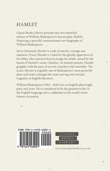 Read & Co. Classics presents this new beautiful edition of William Shakespeare's famous play, "Hamlet". Featuring a specially commissioned new biography of William Shakespeare, it is a must for Shakespeare enthusiasts and newcomers alike. Set in Denmark, ¿Hamlet¿ is a tale of murder, revenge and madness. Prince Hamlet is visited by the ghostly apparition of his father who instructs him to avenge his death, caused by the hands of Hamlet¿s uncle, Claudius. As tension mounts, Hamlet grapples with the pain of sorrow, treachery and mortality. The iconic ¿Hamlet¿ is arguably one of Shakespeare¿s most powerful plays and ranks amongst the most moving and seminal tragedies in English literature. William Shakespeare (1564 - 1616) was an English playwright, poet, and actor. He is considered to be the greatest writer in the English language and is celebrated as the world's most famous dramatist.