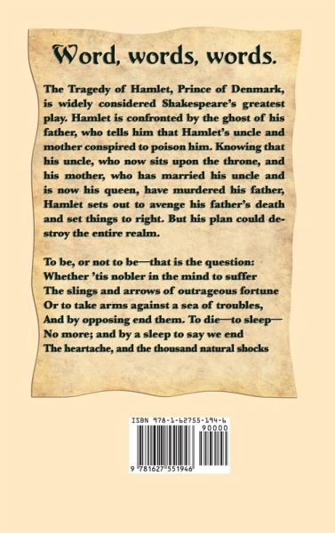 The Tragedy of Hamlet, Prince of Denmark, is widely considered Shakespeare's greatest play. Hamlet is confronted by the ghost of his father, who tells him that Hamlet's uncle and mother conspired to poison him. Knowing that his uncle, who now sits upon the throne, and his mother, who has married his uncle and is now his queen, have murdered his father, Hamlet sets out to avenge his father's death and set things to right. But his plan could destroy the entire realm. To be, or not to be-that is the question: Whether 'tis nobler in the mind to suffer The slings and arrows of outrageous fortune Or to take arms against a sea of troubles, And by opposing end them. To die-to sleep- No more; and by a sleep to say we end The heartache, and the thousand natural shocks