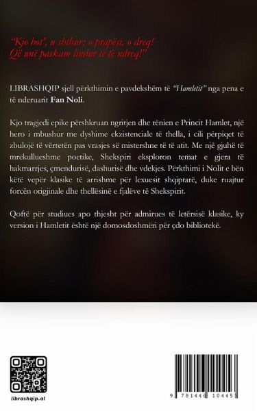 LIBRASHQIP sjell përkthimin e pavdekshëm të "Hamletit" nga pena e të nderuarit Fan Noli. Kjo tragjedi epike përshkruan ngritjen dhe rënien e Princit Hamlet, një hero i mbushur me dyshime ekzistenciale të thella, i cili përpiqet të zbulojë të vërtetën pas vrasjes së mistershne të të atit. Me një gjuhë të mrekullueshme poetike, Shekspiri eksploron temat e gjera të hakmarrjes, çmendurisë, dashurisë dhe vdekjes. Përkthimi i Nolit e bën këtë vepër klasike të arrishme për lexuesit shqiptarë, duke ruajtur forcën origjinale dhe thellësinë e fjalëve të Shekspirit. Qoftë për studiues apo thjesht për admirues të letërsisë klasike, ky version i Hamletit është një domosdoshmëri për çdo bibliotekë.