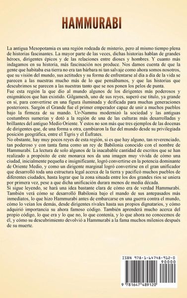 Descubra la fascinante historia de Hammurabi La historia de Hammurabi es la historia de treinta y tres años llenos de conquistas, construcciones de templos, obras de irrigación y desarrollo de leyes, pero también una historia de ruptura de relaciones y de imperios que surgieron y cayeron. Es una historia de traiciones y de alianzas cambiantes, en la que hasta los dioses se inmiscuyen en los asuntos de los hombres. Y el caso es que, aunque ocurrió hace miles de años, parece contemporánea, como si Hammurabi aún estuviera respirando entre nosotros. Y, como ocurre con todos los grandes momentos de la historia del género humano, nos enseña que todos los grandes logros tienen un precio, y que la naturaleza humana siempre ha sido igual de compleja, como cuando los babilonios alababan a Marduk y aclamaron a Hammurabi como a un auténtico dios. En Hammurabi: Una guía fascinante acerca del sexto rey de la primera dinastía babilonia, incluyendo el Código de Hammurabi, encontrará contenidos como estos:Babilonia antes de Hammurabi: la posición de la ciudad en Babilonia y sus primeros dirigentes El ascenso de Hammurabi: guerras, logros y cronología de Hammurabi El reinado de Hammurabi: Babilonia durante su reinado, relaciones con otras ciudades La forma de ser de Hammurabi: aspecto físico, relaciones con otros gobernantes, algunas pistas sobre su personalidad El código de Hammurabi y las primeras leyes en Mesopotamia Diseccionando el código El legado de Hammurabi ¡Y mucho, mucho más! ¡Obtenga este libro y aprenda más acerca de Hammurabi!
