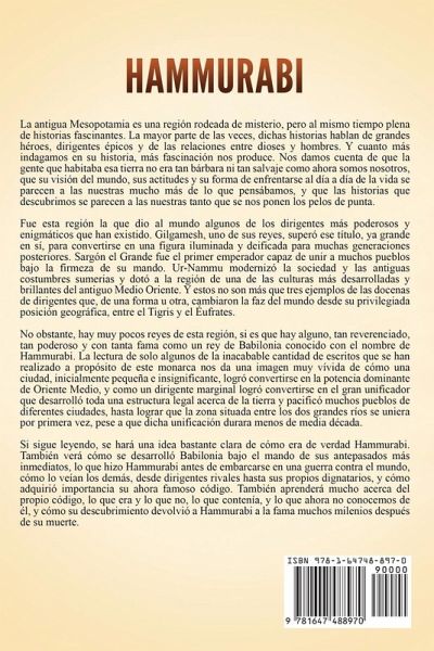 Descubra la fascinante historia de Hammurabi La historia de Hammurabi es la historia de treinta y tres años llenos de conquistas, construcciones de templos, obras de irrigación y desarrollo de leyes, pero también una historia de ruptura de relaciones y de imperios que surgieron y cayeron. Es una historia de traiciones y de alianzas cambiantes, en la que hasta los dioses se inmiscuyen en los asuntos de los hombres. Y el caso es que, aunque ocurrió hace miles de años, parece contemporánea, como si Hammurabi aún estuviera respirando entre nosotros. Y, como ocurre con todos los grandes momentos de la historia del género humano, nos enseña que todos los grandes logros tienen un precio, y que la naturaleza humana siempre ha sido igual de compleja, como cuando los babilonios alababan a Marduk y aclamaron a Hammurabi como a un auténtico dios. En Hammurabi: Una guía fascinante acerca del sexto rey de la primera dinastía babilonia, incluyendo el Código de Hammurabi, encontrará contenidos como estos:Babilonia antes de Hammurabi: la posición de la ciudad en Babilonia y sus primeros dirigentes El ascenso de Hammurabi: guerras, logros y cronología de Hammurabi El reinado de Hammurabi: Babilonia durante su reinado, relaciones con otras ciudades La forma de ser de Hammurabi: aspecto físico, relaciones con otros gobernantes, algunas pistas sobre su personalidad El código de Hammurabi y las primeras leyes en Mesopotamia Diseccionando el código El legado de Hammurabi ¡Y mucho, mucho más! ¡Obtenga este libro y aprenda más acerca de Hammurabi!