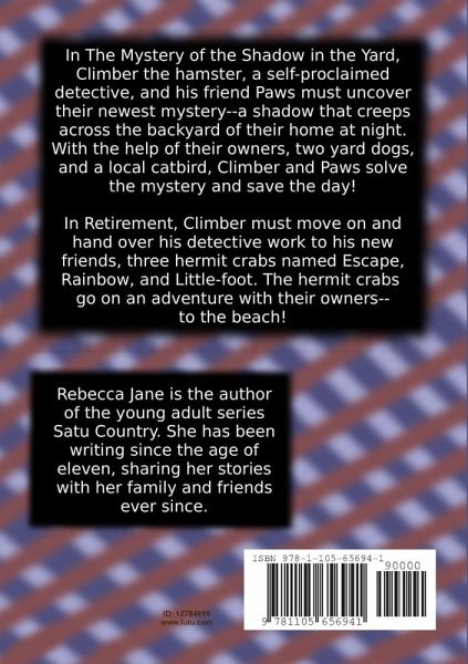 In The Mystery of the Shadow in the Yard, Climber the hamster, a self-proclaimed detective, and his friend Paws must uncover their newest mystery--a shadow that creeps across the backyard of their home at night. With the help of their owners, two yard dogs, and a local catbird, Climber and Paws solve the mystery and save the day! In Retirement, Climber must move on and hand over his detective work to his new friends, three hermit crabs named Escape, Rainbow, and Little-foot. The hermit crabs go on an adventure with their owners--to the beach!