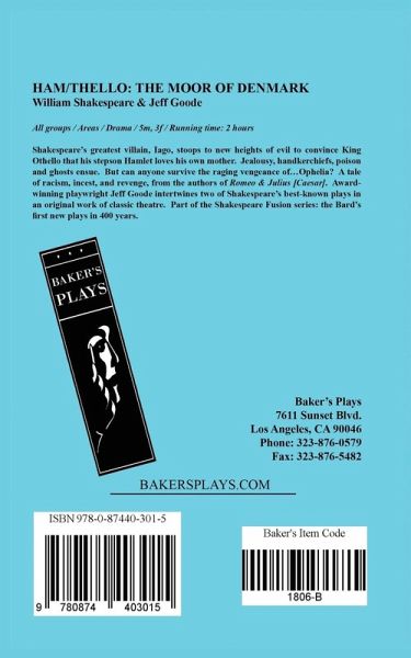All groups / Areas / Drama / 5m, 3f / Running time: 2 hours Shakespeare's greatest villain, Iago, stoops to new heights of evil to convince King Othello that his stepson Hamlet loves his own mother. Jealousy, handkerchiefs, poison and ghosts ensue. But can anyone survive the raging vengeance of.Ophelia? A tale of racism, incest, and revenge, from the authors of Romeo & Julius [Caesar]. Award-winning playwright Jeff Goode intertwines two of Shakespeare's best-known plays in an original work of classic theatre. Part of the Shakespeare Fusion series: the Bard's first new plays in 400 years.