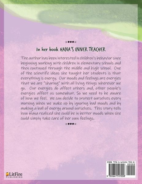In her book HANA'S INNER TEACHER The author has been interested in children's behavior since beginning working with children in elementary schools and then continued through the middle and high school. One of the scientific ideas she taught her students is that everything is energy. Our moods and feelings are energies that we are "sharing" with all living things wherever we go. Our energies do affect others and, other people's energies affect us somewhat. So we need to be aware of how we feel. We can decide to protect ourselves every morning when we wake up by ignoring bad moods and by making a ball of energy around ourselves. This story tells how Hana realized she could be in better moods when she could simply take care of her own feelings.