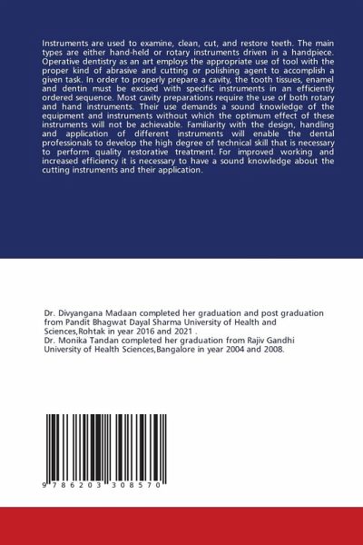 Instruments are used to examine, clean, cut, and restore teeth. The main types are either hand-held or rotary instruments driven in a handpiece. Operative dentistry as an art employs the appropriate use of tool with the proper kind of abrasive and cutting or polishing agent to accomplish a given task. In order to properly prepare a cavity, the tooth tissues, enamel and dentin must be excised with specific instruments in an efficiently ordered sequence. Most cavity preparations require the use of both rotary and hand instruments. Their use demands a sound knowledge of the equipment and instruments without which the optimum effect of these instruments will not be achievable. Familiarity with the design, handling and application of different instruments will enable the dental professionals to develop the high degree of technical skill that is necessary to perform quality restorative treatment. For improved working and increased efficiency it is necessary to have a sound knowledge about the cutting instruments and their application.