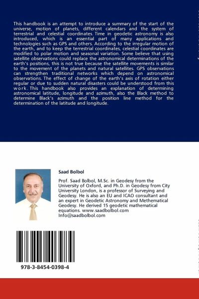 This handbook is an attempt to introduce a summary of the start of the universe, motion of planets, different calendars and the system of terrestrial and celestial coordinates. Time in geodetic astronomy is also introduced, which is an essential part of many applications and technologies such as GPS and others.According to the irregular motion of the earth, and to keep the terrestrial coordinates, celestial coordinates are modified to polar motion and seasonal variation.Some believe that using satellite observations could replace the astronomical determinations of the earth s positions, this is not true because the satellite movements is similar to the movement of the planets and natural satellites. GPS observations can strengthen traditional networks which depend on astronomical observations.The effect of change of the earth s axis of rotation either regular or due to sudden natural disasters could be understood from this work.This handbook also provides an explanation of determining astronomical latitude, longitude and azimuth, also the Black method to determine Black s azimuth and the position line method for the determination of the latitude and longitude.