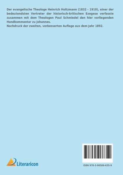 Der evangelische Theologe Heinrich Holtzmann (1832 - 1910), einer der bedeutendsten Vertreter der historisch-kritischen Exegese verfasste zusammen mit dem Theologen Paul Schmiedel den hier vorliegenden Handkommentar zu Johannes. Nachdruck der zweiten, verbesserten Auflage aus dem Jahr 1892.