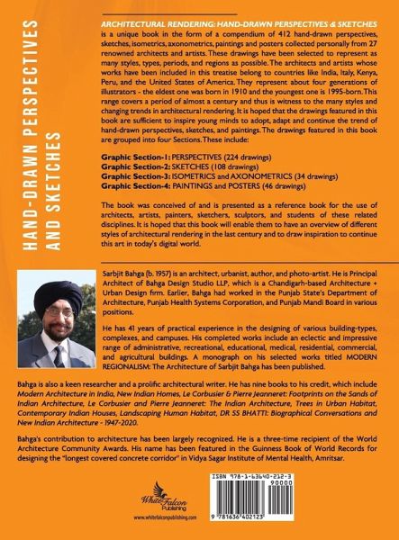 ARCHITECTURAL RENDERING: HAND-DRAWN PERSPECTIVES & SKETCHES is a unique book in the form of a compendium of 412 hand-drawn perspectives, sketches, isometrics, axonometrics, paintings and posters collected personally from 27 renowned architects and artists. These drawings have been selected to represent as many styles, types, periods, and regions as possible. The architects and artists whose works have been included in this treatise belong to countries like India, Italy, Kenya, Peru, and the United States of America. They represent about four generations of illustrators - the eldest one was born in 1910 and the youngest one is 1995-born. This range covers a period of almost a century and thus is witness to the many styles and changing trends in architectural rendering. It is hoped that the drawings featured in this book are sufficient to inspire young minds to adopt, adapt and continue the trend of hand-drawn perspectives, sketches, and paintings. The drawings featured in this book are grouped into four Sections. These include: Graphic Section-1: PERSPECTIVES (224 drawings) Graphic Section-2: SKETCHES (108 drawings) Graphic Section-3: ISOMETRICS and AXONOMETRICS (34 drawings) Graphic Section-4: PAINTINGS and POSTERS (46 drawings) The book was conceived of and is presented as a reference book for the use of architects, artists, painters, sketchers, sculptors, and students of these related disciplines. It is hoped that this book will enable them to have an overview of different styles of architectural rendering in the last century and to draw inspiration to continue this art in today's digital world.
